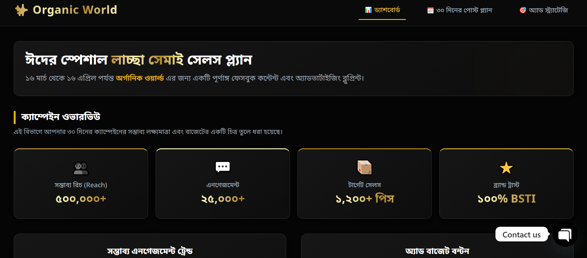 Organic World-এর ঈদ স্পেশাল লাচ্ছা সেমাই ক্যাম্পেইনের জন্য ৩০ দিনের Facebook content plan ও ad strategy blueprint, যেখানে reach, engagement, sales growth এবং BSTI-based brand trust-এর উপর ফোকাস করা হয়েছে।